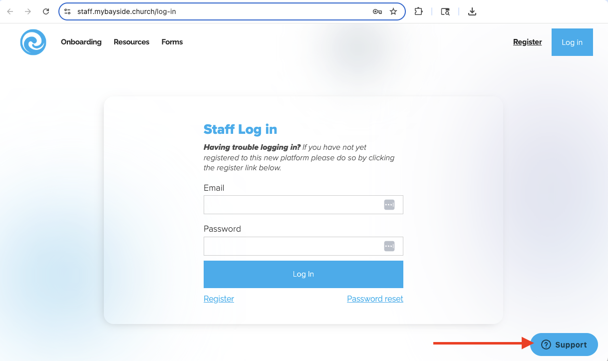 - If you have any issues or questions, please open a ticket with Bayside IT at: https://staff.mybayside.church/log-in. Click this Support Button, and it will direct you to our Staff website to make a ticket. Then click on this same picture in the bottom right-hand corner. You do not need to log in to submit a support ticket.