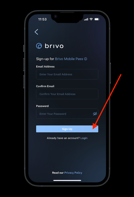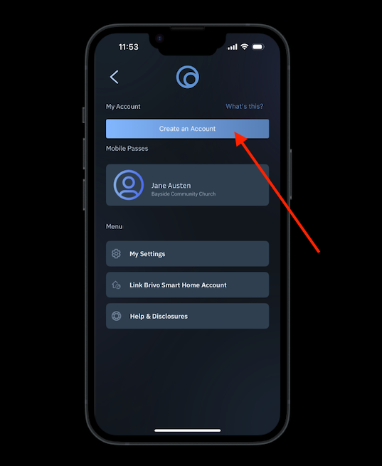 IMPORTANT: If it says "Create an Account" on your screen, you must create an account. Having a Brivo pass installed on your phone is not the same as having a Brivo account. If you see the blue button below, create the account.